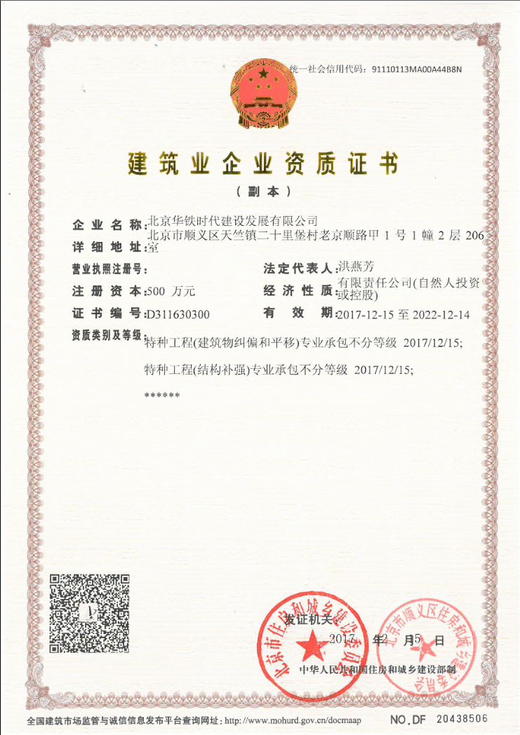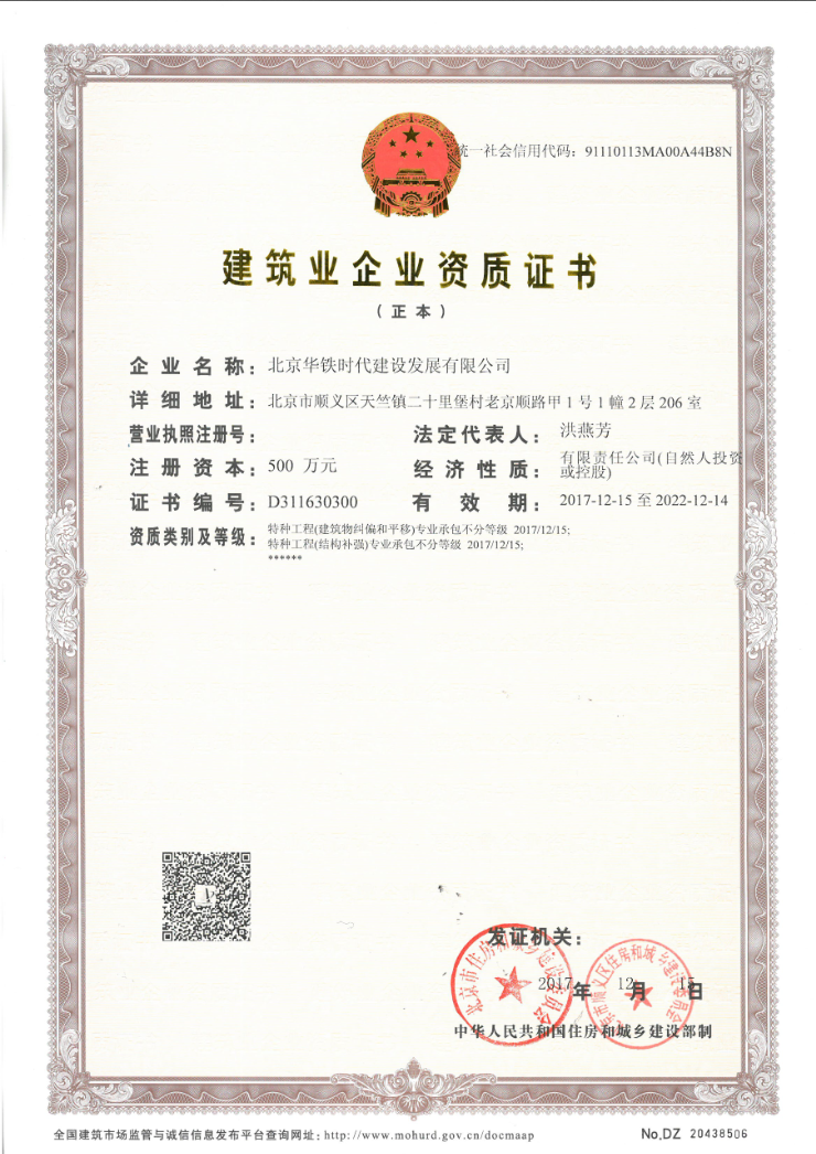 北京华铁时代建设发展有限公司成立于2015年,是一家由年轻有为的专业工程师创办的集设计、施工、劳务、特种设备研发销售一体的高技术型公司,公司具有特种工程(结构补强、建筑物平移)不分等级资质证书。现有在职人员20余人,其中高级工程师1人、中国一级注册结构工程师2名,中国一级注册建造师2名,二级建造师1名,欧洲注册结构工程师1名。技术员若干名。外聘专家3名,一名为知名结构工程专家,一名为知名岩土工程专家,一名为知名铁道工程专家。服务范围:高铁隧道和路基的病害综合治理、结构加固改造、建筑基坑支护、地基处理、结构顾问和幕墙顾问等。